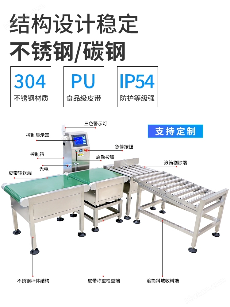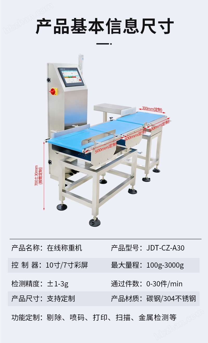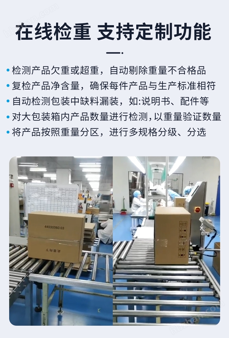 自動稱重機(jī)是一種高速度、高精度的在線檢重設(shè)備,可按照產(chǎn)品大小、重量大小等級分組進(jìn)行篩選,可與各種包裝生產(chǎn)線以及輸送系統(tǒng)集成,主要用于在線檢測產(chǎn)品重量是否合格,包裝內(nèi)是否缺少部件或說明書等。高精度自動稱重機(jī)分選速度快、精度穩(wěn)定,能夠節(jié)省更多的人力物力,提高企業(yè)生產(chǎn)周期效率,可廣泛應(yīng)用于制藥、日化、食品、化工、電池、五金配件、電子、塑膠等行業(yè)。