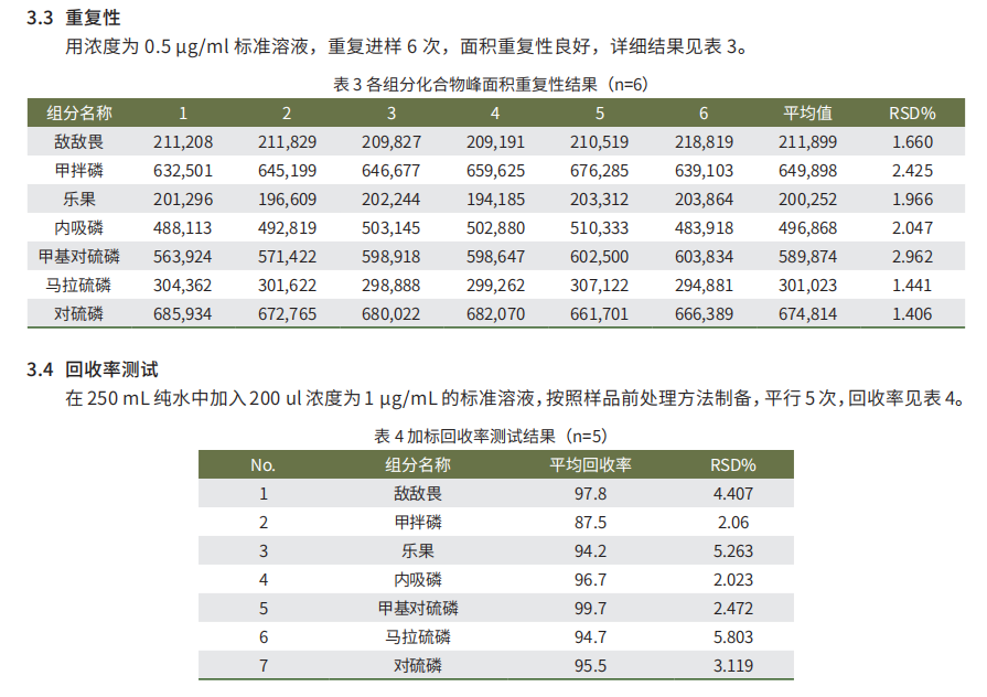 有機磷農(nóng)藥是 20 世紀 40 年代發(fā)展起來的一類廣譜性農(nóng)用殺蟲劑,其特點是高毒性,殺蟲范圍廣。在我國有 機磷殺蟲劑產(chǎn)量高。有機磷農(nóng)藥殘留的檢測方法有氣相色譜法和氣質(zhì)聯(lián)用法等。2022 年頒布的中華人民共和國國 家標準中要求檢測生活飲用水中有機磷農(nóng)藥的殘留量。《生活飲用水標準檢驗方法》中測定樂果等 7 種有 機磷。本方法,一次性檢測 7 種有機磷農(nóng)藥,且方法快速,靈敏,分離效果好,重復性好,準確度高,可以滿足國 標中關(guān)于生活飲用水有機磷農(nóng)藥殘留的檢測要求。