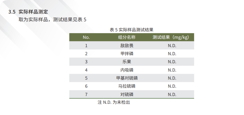 1.1 儀器 氣相色譜儀:GC-2018 氣相色譜儀 1.2 分析條件 GC-2018 分析條件: 色譜柱:InertCap1701,30 m×0 柱溫程序:120℃(1 min) 20℃ /min 190℃ (20 min)  .32 mm×0.25 μm 進樣口溫度:270℃ 進樣方式:不分流 柱流量:2 ml/min FPD:270℃